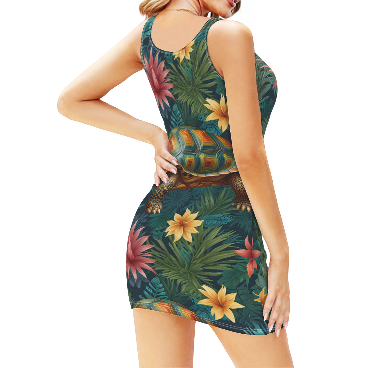 Tropical Tortoise Pattern Sleeveless Slim-Fit Euro-Size Tank Slip Dress